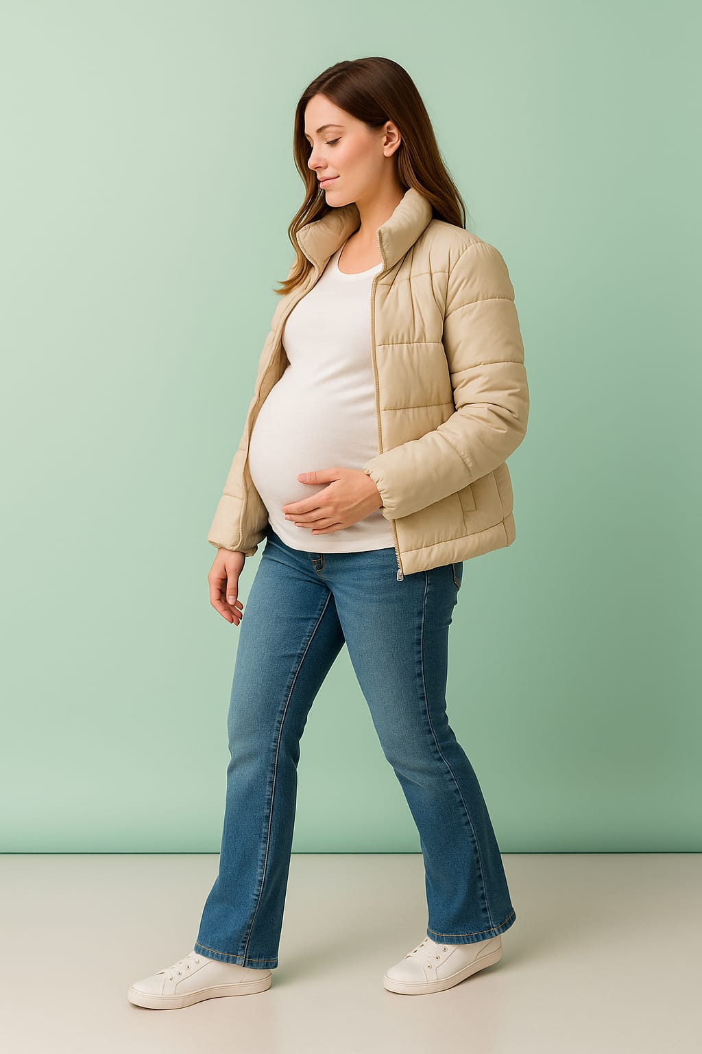 Our flared jeans blend comfort and elegance seamlessly. The high-rise, stretchy waistband provides gentle support, and the wide-leg flare adds a stylish touch. A versatile addition to every mom-to-be’s wardrobe.